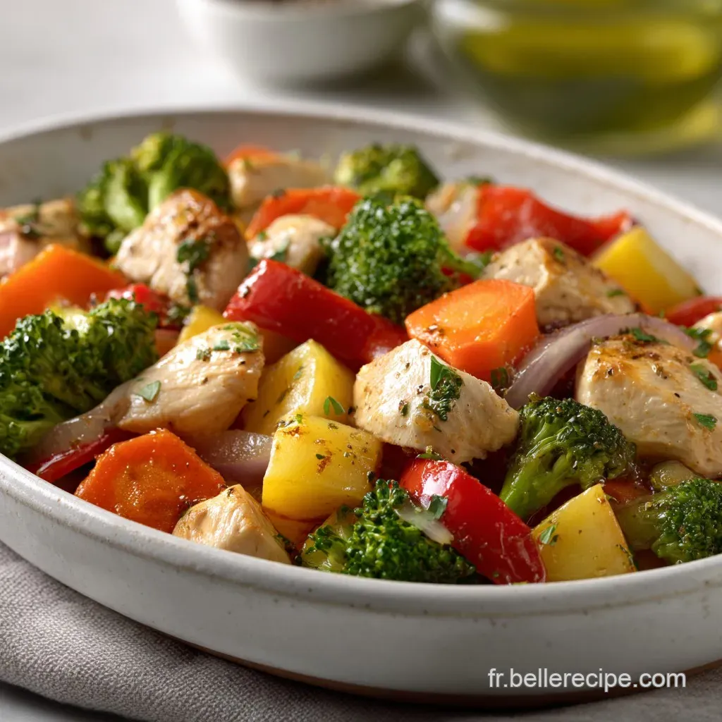 - Saveur/Texture: Poulet tendre et légumes rôtis fondants