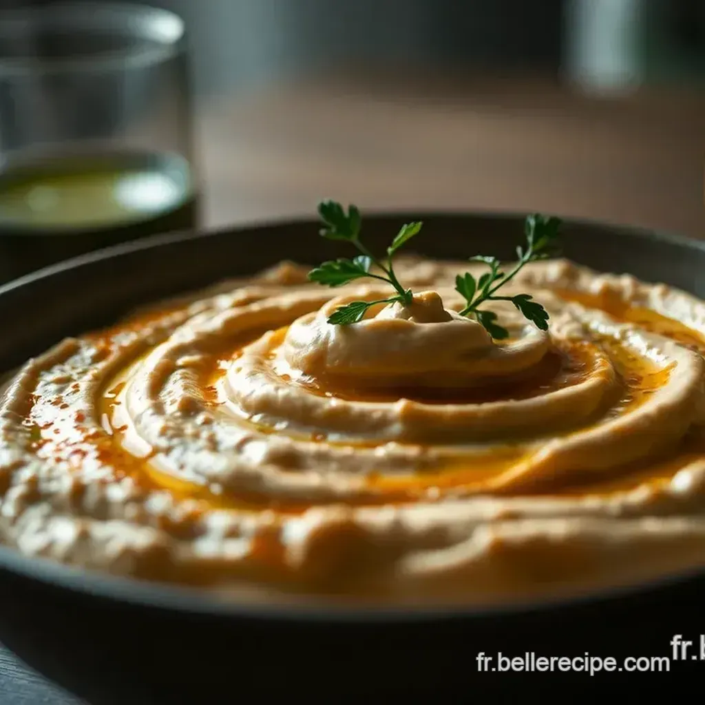 - On sert et on décore : On transfère dans un bol, on fait un petit puits au centre, on arrose d'huile d'olive et on saupoudre de paprika. Transférer dans un bol, faire un puits au centre, arroser d'huile d'olive. Garnir de paprika ou de persil.