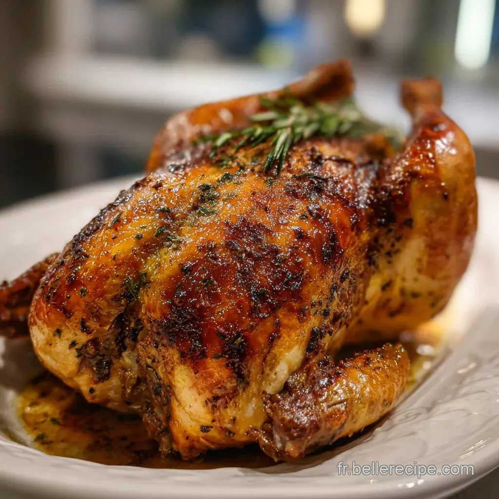 Ajoute quelques brins de romarin frais au dernier moment pour le rappel aromatique. Si tu veux vraiment impressionner, découpe la volaille à table. C'est un moment convivial qui rappelle les grands repas de famille.